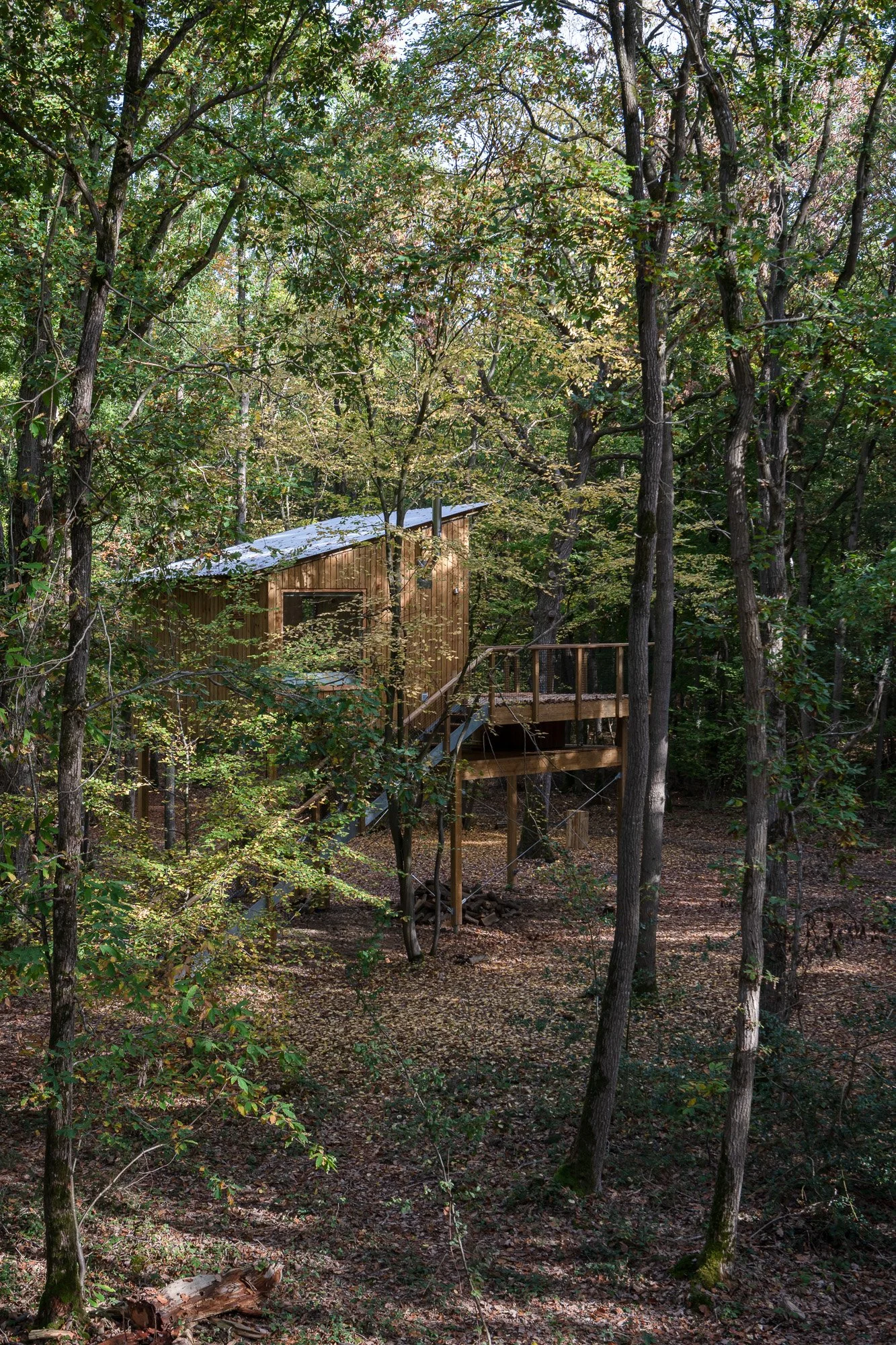 Le Parisien décrit "dix-huit cabanes dans la forêt à La Couture-Boussey, dans l'Eure — les cabanes, entourées de 32 hectares de forêt, s'intègrent sous les frondaisons."